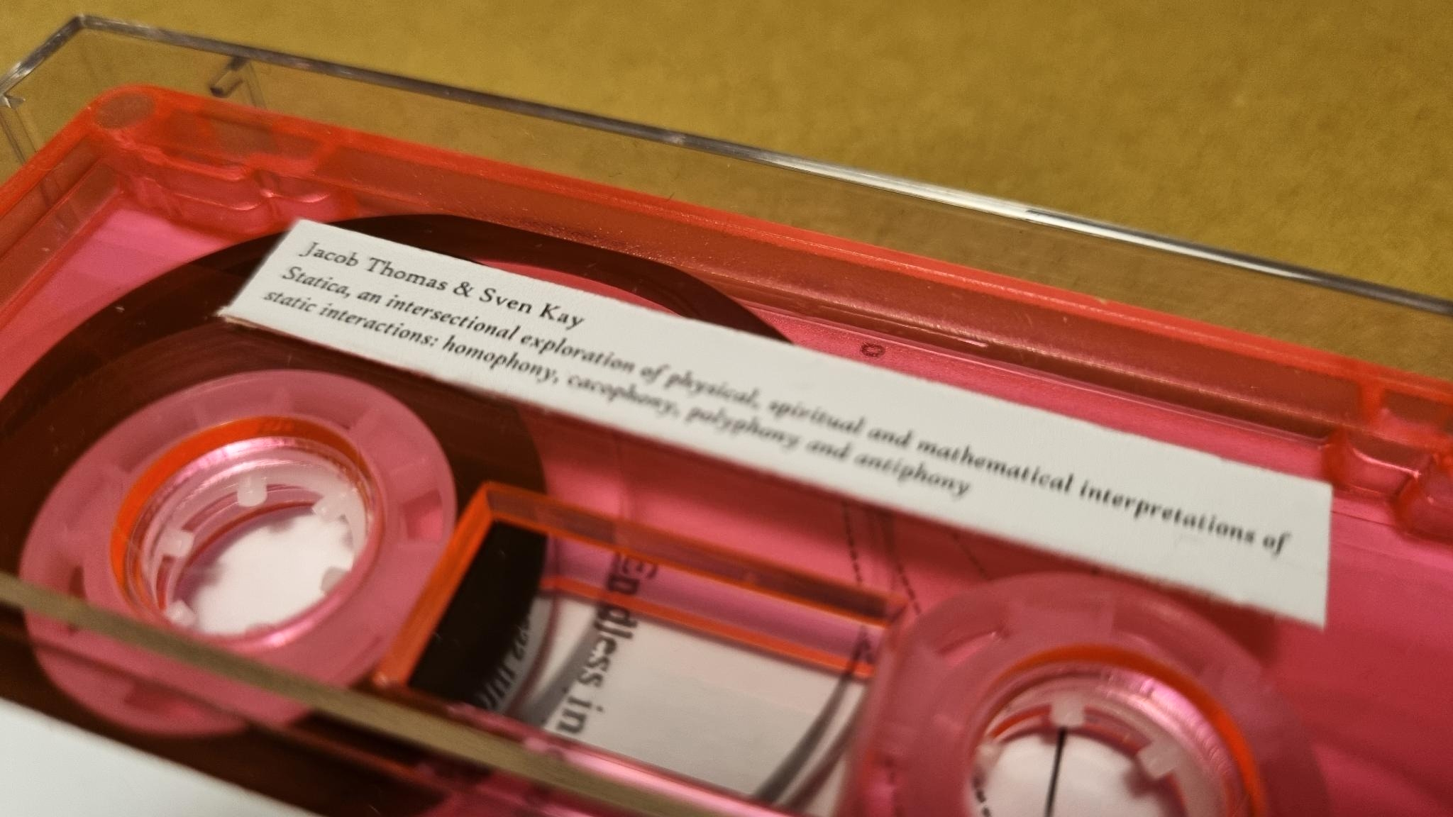 It ended up being an endlessly interesting project, even if we (and I must certainly take the blame here, for the delays were pretty much entirely my fault) did not realise all of the ideas we had for it. Somehow, however, that fits this tape, which ended up being called Statica, an intersectional exploration of physical, spiritual and mathematical interprations of static interactions: homophony, cacophony, polyphony and antiphony. It is, without meaning to be pretentious, wildly ambitious, of course: a tape that attempts to connect a truly wild array of concepts by its approach to sound, by equating ((re)interpretations of) (literally) audio engineering (acoustics, physical effects, etc.) to Lacanian psychoanalysis, mathematical concepts of infinity and a myriad of pathways into and out of spirituality. It seeks to redefine or recast terms such as homophony and antiphony in the context of explorations of static. I think we (meaning, perhaps again, I – I wish to give Jacob all the credit in the world for his lucidity and intelligence) almost got lost in the endless meanings we could instill our work with. That it ended up, against all initial plans, a simple tape in a simple case with a simple J-card, is, then, probably apt. More than that might only destract from all it tries to say.