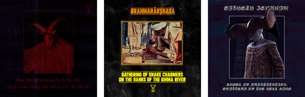 The first three sacrifices can also be found on the channel: We Are Gods, Deciding Who Will Live And Who Will Die by Demon Priest Performing Sacrifice At The Altar; Gathering Of Snake Charmers On The Banks Of The Bhima River by BrahmarākŞhasa; and Angel Of Prostitution, Emissary Of The Hell King by Eisheth Zenunim.